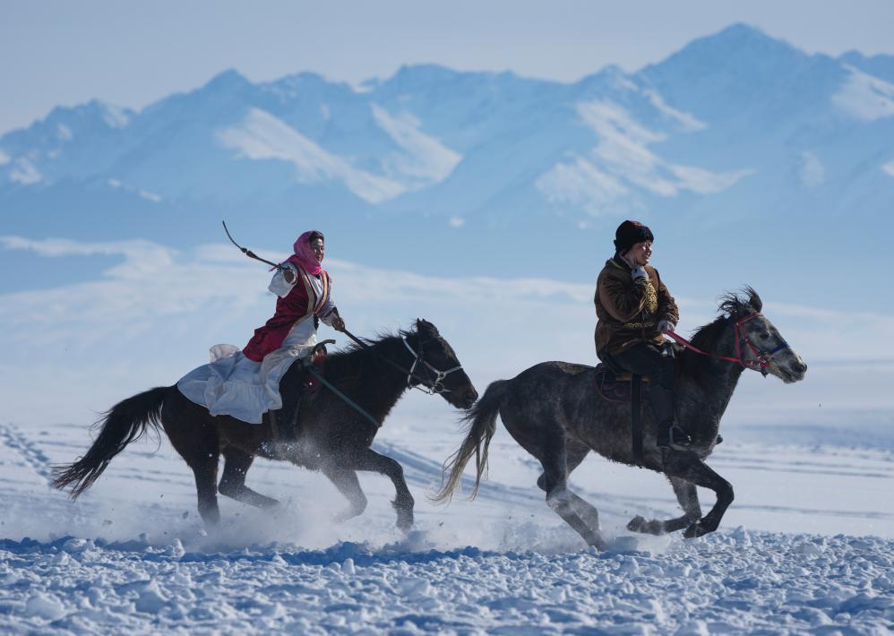 牧民在新疆昭苏县湿地公园为游客展示非遗“姑娘追”。新华社记者 胡虎虎 摄